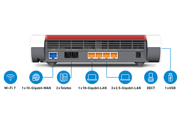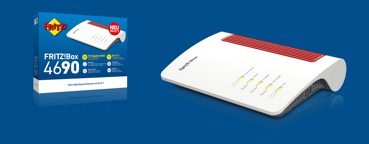 Die FRITZ!Box 4690 mit innovativem Wi-Fi 7 entfaltet ihr volles Geschwindigkeitspotenzial idealerweise an einem Glasfaser-Modem. Hier verteilt die neue Box das Glasfasertempo rasend schnell von bis zu 10 GBit/s über einen 10-GBit/s-WAN-Port, einen 10-GBit/s-LAN-Port und drei 2,5-GBit/s-LAN-Anschlüsse im Heimnetz. Die FRITZ!Box 4690 erreicht als Dualband-Router drahtlos bis zu 6,9 GBit/s. Über den Funkstandard DECT ULE sind vielfältige Smart-Home-Anwendungen wie Wärme und Energieeffizienz möglich.