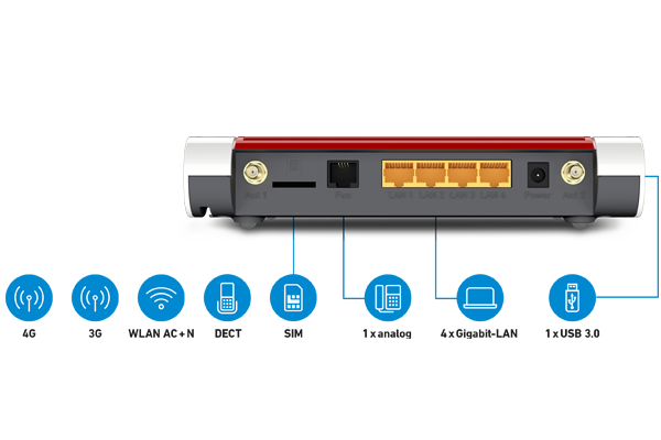 - WLAN-Router mit integriertem LTE-Kategorie-4-Modem für FDD Band 1 (2,1 GHz), Band 3 (1,8 GHz), Band 5 (850 MHz), Band 7 (2,6 GHz), Band 8 (900 MHz), Band 20 (800 MHz), Band 28 (700 MHz) und Band 32 (1,5 GHz)