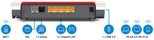 - Integriertes Modem für alle (V)DSL-Anschlüsse bis 300 MBit/s (inklusive Supervectoring) und ADSL2+