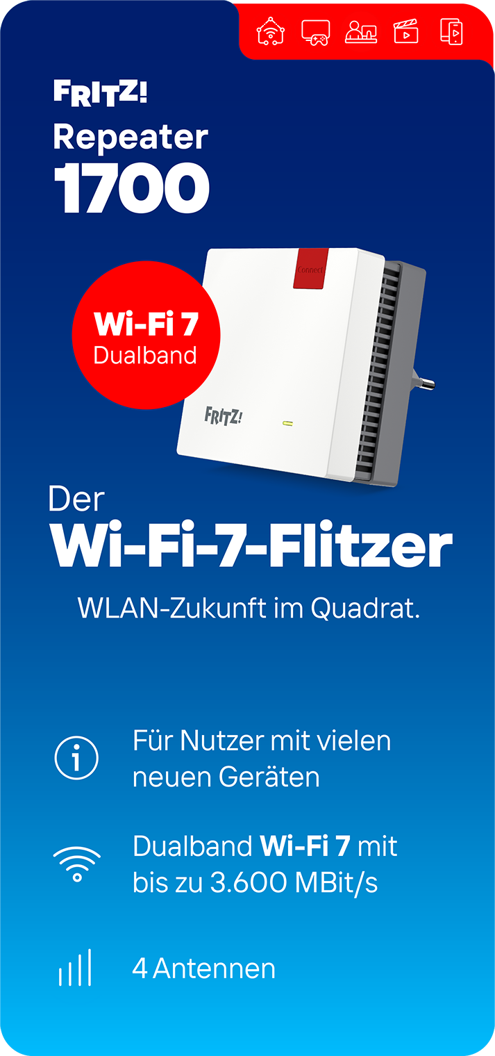 Die Wi-Fi-7-FRITZ!-Produkte bieten höchste Geschwindigkeiten und minimale Latenzen – schnell, stabil und dank WLAN Mesh überall zuverlässig.