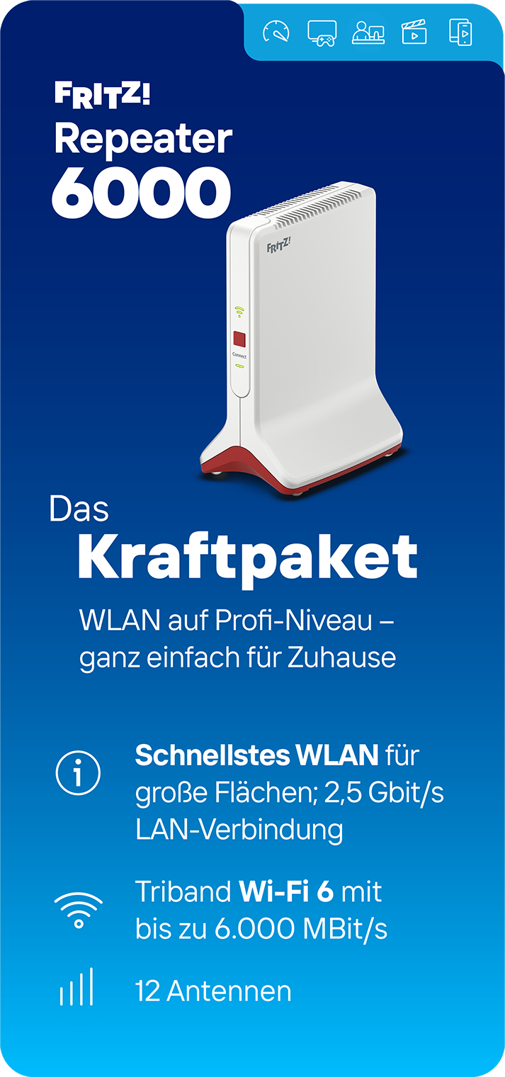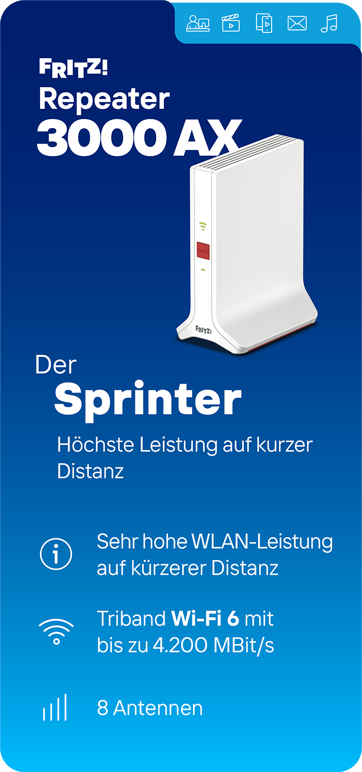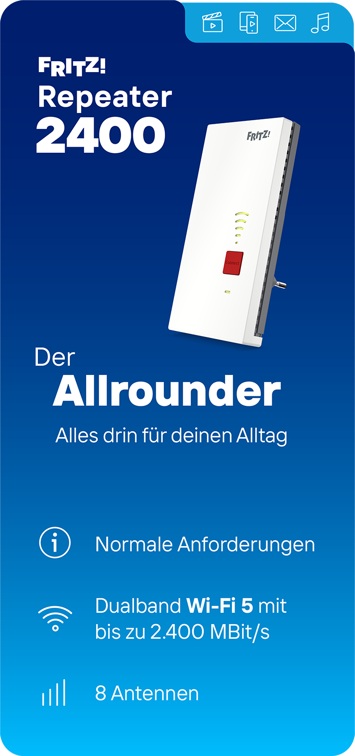 „Wer steht denn da wieder auf dem WLAN-Kabel?" Jeder kennt sie, aber solche Sprüche gehören ab jetzt der Vergangenheit an. FRITZ!Repeater rein, Funkloch raus: Mit unseren FRITZ!Repeatern bringst du mehr Reichweite, mehr Speed und mehr gute Laune ins Netz deiner Kunden. Finde jetzt den FRITZ!Repeater, der am besten zu deren Anforderungen passt.