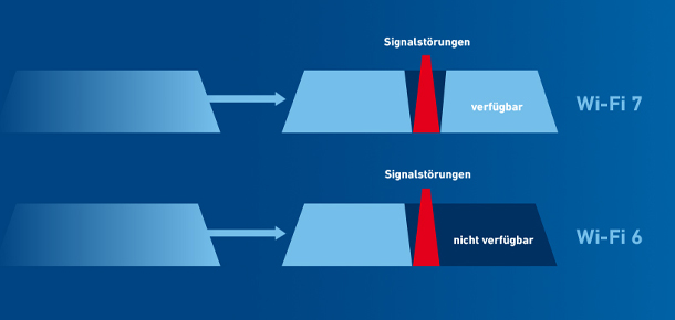 Neben den 2,4- und 5-Gigahertz-Frequenzbändern bietet Wi-Fi 7 zusätzlich die Möglichkeit, das 6-Gigahertzband zu nutzen. Damit wird eine neue, wahnsinnig breite und zugleich störungsfreie Superschnellstrasse bei 500 MHz ohne Lücke eröffnet. Ein weiterer Vorteil des neuen Frequenzbandes: Kein Radar kann mehr stören.