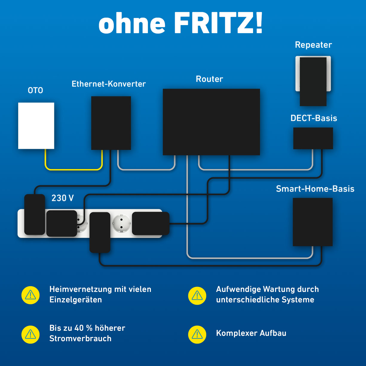 Rate deinen Kunden, auf Glasfaser-Router von FRITZ! umzusteigen, denn die Glasfasertechnologie verspricht hohe Geschwindigkeiten, geringe Latenzen und Robustheit! Und das Beste: die FRITZ!Box macht das Glasfasermodem der Netzbetreiber, den sogenannten OTO (Optical Termination Outlet) überflüssig, denn unsere Fiber-Modelle laufen direkt am Anschluss.