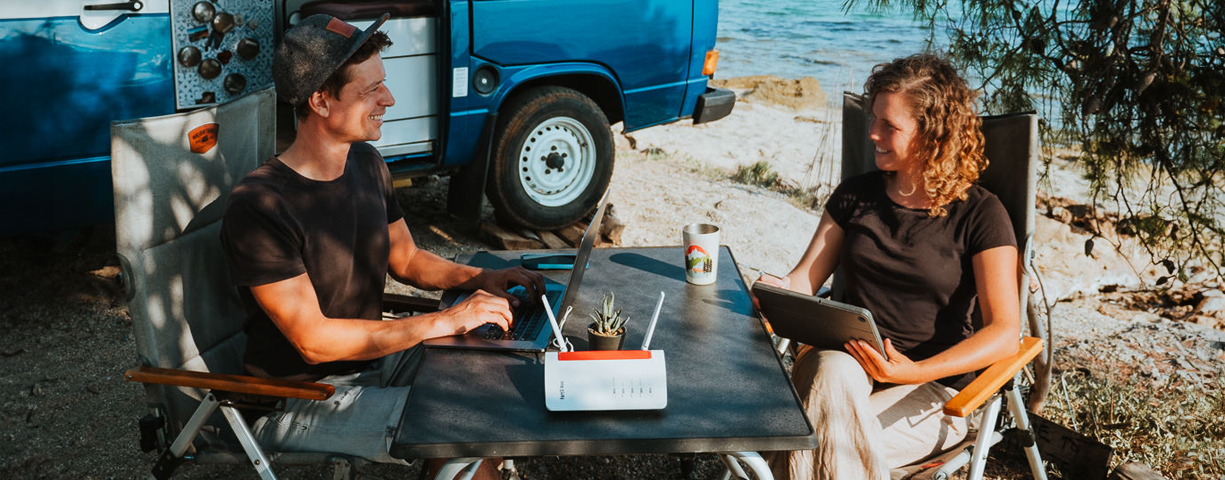 Mit FRITZ! bist du an jedem abgelegenen Ort bestens mit einem sicheren Netzwerk verbunden. Thomas und Regina von dem Instagram-Kanal "Edelweiss On The Road" zeigen dir in mehreren Teilen, wie das funktioniert.