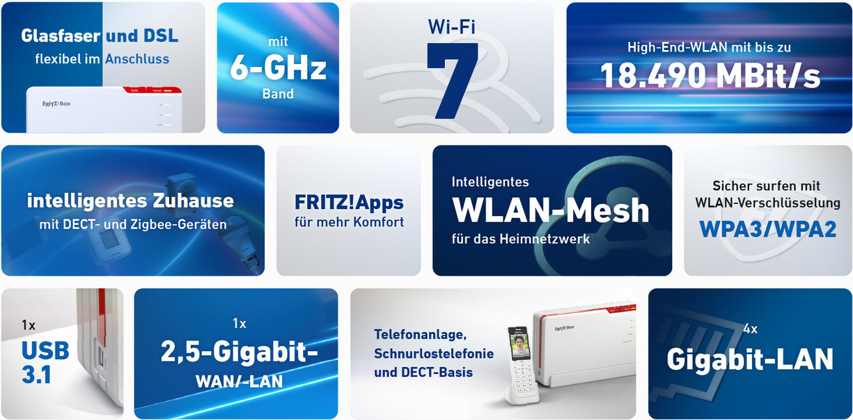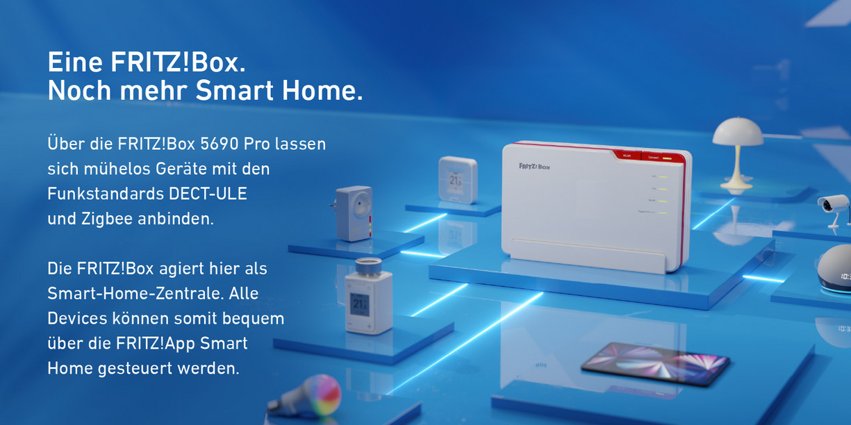 Die FRITZ!Box 5690 Pro setzt neue Massstäbe mit Wi-Fi 7, dem 6 GHz Frequenzband und Geschwindigkeiten bis zu 18.490 MBit/s.