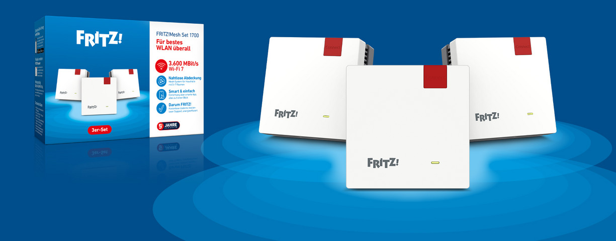 Das FRITZ!Mesh Set 1700 bietet im 2er- oder 3er-Set mit Wi-Fi 7 schnelles und leistungsstarkes WLAN Mesh mit bis zu 3.600 MBit/s. Nach komfortabler Einrichtung per App genießen Nutzer in nur wenigen Minuten nahtloses WLAN in jedem Raum. Seamless Coverage ermöglicht ultraschnelles Surfen, Streamen und Gaming im gesamten Heimnetz. Wi-Fi 7 sorgt zudem für stabilere Verbindungen, geringere Latenzen und optimale Bandbreitennutzung. Das FRITZ!Mesh Set 1700 bringt alle bekannten FRITZ!-Vorteile mit: leistungsstarkes FRITZ!OS, regelmäßige Updates, kostenfreier Support, hohe Sicherheit und Energieeffizienz sowie 5 Jahre Garantie – für ein rundum überzeugendes Gesamtpaket ohne versteckte Kosten.