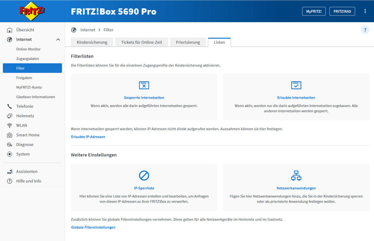 - Die Filterlisten (erlaubte/gesperrte Internetseiten) kannst du für die einzelnen Zugangsprofile der Kindersicherung aktivieren. Wenn Internetseiten gesperrt werden, können IP-Adressen nicht direkt aufgerufen werden. Ausnahmen kannst du dort auch festlegen. Die Verwaltung der IP-Sperrliste sowie die Sperre von bestimmten Netzwerkanwendungen wie z. B. FTP-Server findest du ebenso hier. So steuerst du präzise, welche Inhalte und Dienste im Netzwerk genutzt werden dürfen – transparent, nachvollziehbar und flexibel anpassbar.