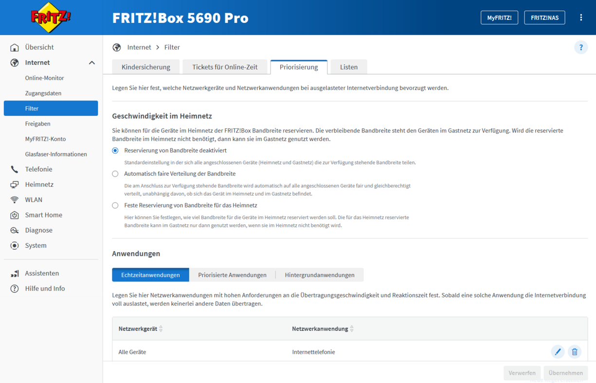 - Im Bereich Priorisierung legst du fest, welche Netzwerkgeräte und Netzwerkanwendungen bei ausgelasteter Internetverbindung bevorzugt werden. Du kannst für die Geräte im Heimnetz der FRITZ!Box ebenso Bandbreite reservieren. Die verbleibende Bandbreite steht den Geräten im Gastnetz zur Verfügung. Wird die reservierte Bandbreite im Heimnetz nicht benötigt, dann kann sie im Gastnetz genutzt werden.