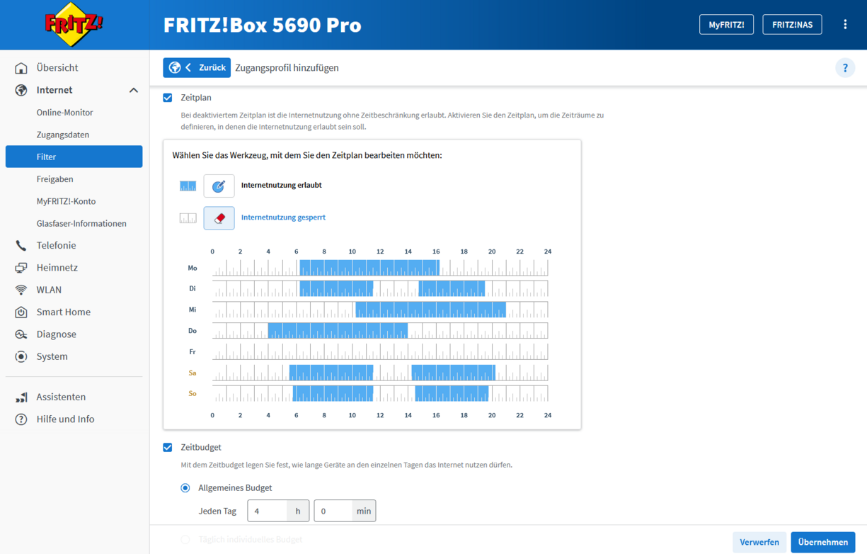 - Internet nur zu definierten Zeiten erlauben: Aktiviere die Option „Zeitplan“ und lege fest, in welchen Zeiträumen die Internetnutzung erlaubt oder gesperrt ist.