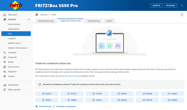 Mit sogenannten Zeittickets kannst du Geräten mit eingeschränkter Internetnutzung kurzfristig zusätzliche Online-Zeit gewähren – zum Beispiel für spontane Recherchen, verlängerte Schulungen oder Ausnahmesituationen im Arbeitsalltag. Ein Zeitticket ermöglicht 45 Minuten zusätzlichen Internetzugang.