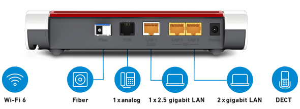 - Für den Anschluss an die Glasfaser mit FRITZ!SFP-Modul AON, GPON oder XGS-PON