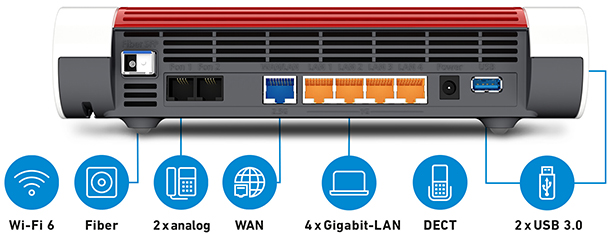 - Für den Anschluss an die Glasfaser mit FRITZ!SFP-Modul AON, GPON oder XGS-PON