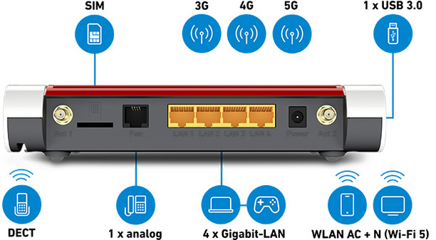 Die FRITZ!Box 6850 5G versorgt dein Heimnetz mit Highspeed-Internet nach dem neuesten Mobilfunkstandard 5G. Schnellste Downloads und verzögerungsfreier Streaming-Spaß sind jetzt kabellos möglich. Verwende deine FRITZ!Box 6850 5G als Tor ins Internet auf Wunsch an mehreren Standorten, zum Beispiel zu Hause, im Büro oder in der Ferienwohnung.