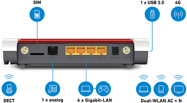 FRITZ!Box 6850 LTE liefert schnelle Downloads mit LTE und du genießt den vollen FRITZ!Box-Komfort: Die integrierte DECT-Basis sorgt mit bis zu sechs Schnurlostelefonen für Telefonie-Genuss. Zuverlässiges WLAN verbindet deine Geräte im Heimnetz mit dem schnellen Mobilfunk-Internet.