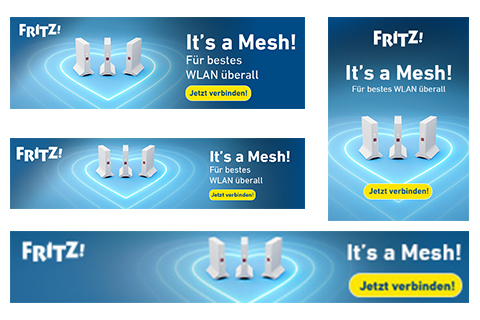 Steigere deinen Verkauf der neuen FRITZ!Mesh Wi-Fi Sets mit unseren brandneuen Online-Bannern. Lade sie ganz einfach unter Marketing > Downloads herunter und platziere sie direkt auf deiner Website.