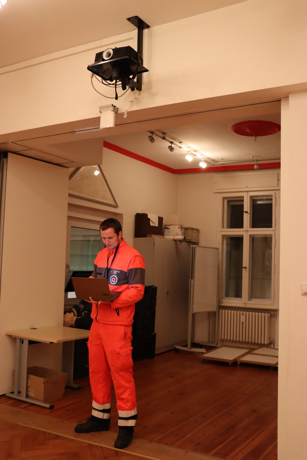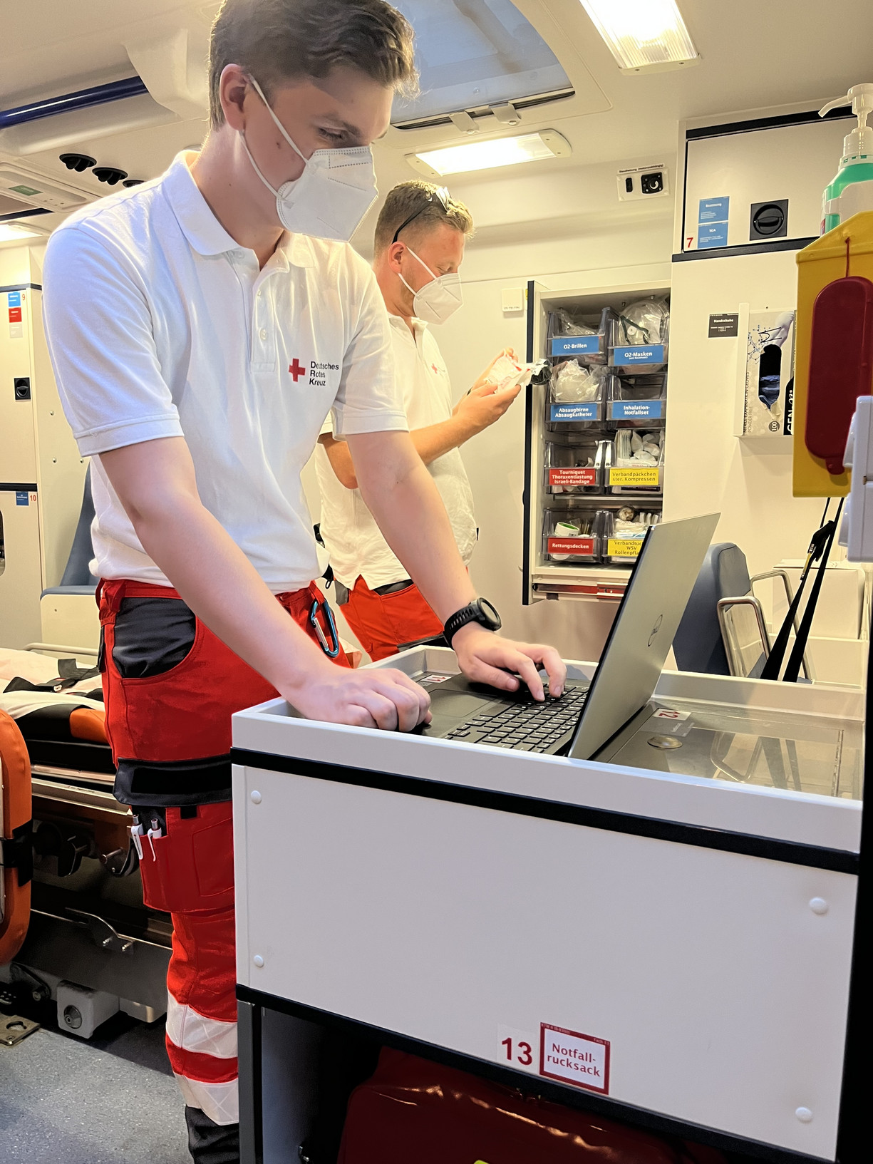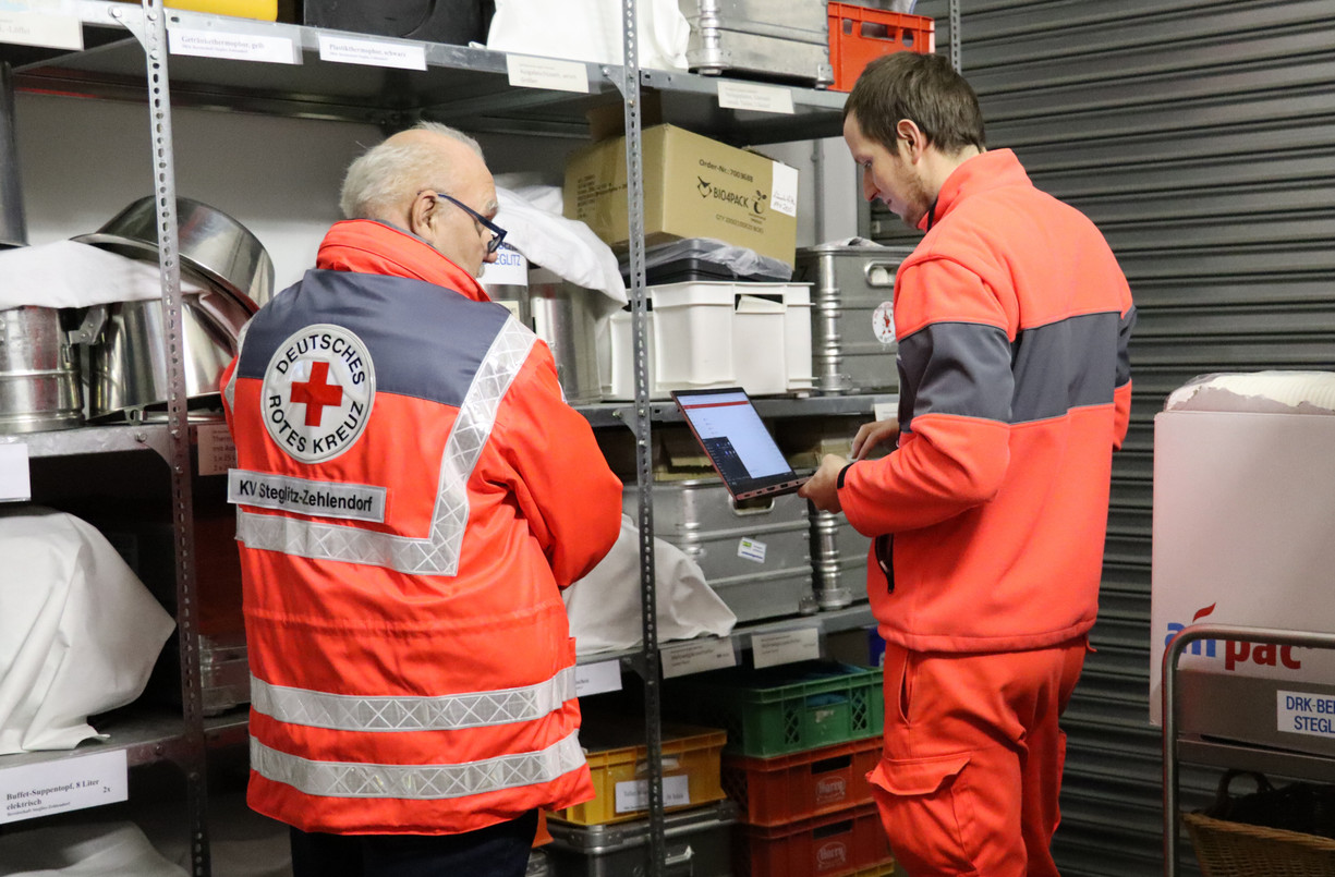 Die Büros und Ausbildungsräume des DRK Steglitz-Zehlendorf sind in einer alten Villa im Südwesten Berlins untergebracht. Auf demselben Gelände, etwa 15 Meter hinter der Villa, befindet sich eine Stahlbetonhalle, in der das Lager und die Fahrzeuge des Vereins untergebracht sind. Hier werden Ausrüstungsgegenstände, Ersatzteile und sonstiges Material aufbewahrt, das bei Einsätzen aller Art benötigt wird. Über den Bestand wird genau Buch geführt – schließlich muss auf Knopfdruck herauszufinden sein, wann z. B. der TÜV für ein Fahrzeug erneuert werden muss oder wie viele Feldbetten gerade wohin verliehen wurden.