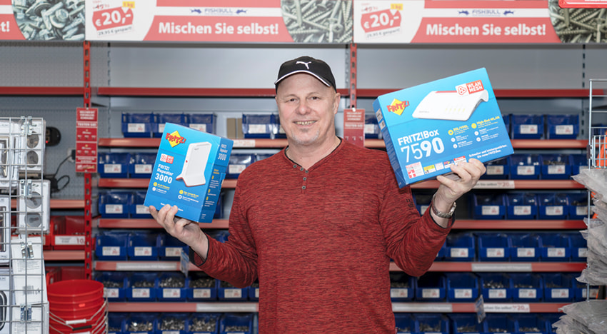 Künftig sollen zudem alle Filialen der Sonderpreis Baummärkte zentral mit Informationen, Werbung und gemeinsamen Aktionen gesteuert werden. Damit wächst die heterogene Filial-Struktur enger zusammen und der gemeinsame Markenauftritt für den Kunden wird verbessert. Unterschiede zwischen den Filialen gibt es dann keine mehr, weder bei den Sonderangeboten noch beim Service. Auch hier hilft FRITZ! bei der zuverlässigen Vernetzung.