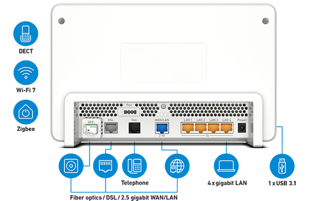 El FRITZ!Box 5690 Pro ofrece total flexibilidad para fibra óptica. Este nuevo modelo de gama alta se adapta a las conexiones de fibra óptica más habituales; incluye en el paquete dos módulos SFP para los estándares GPON y AON, también posee un puerto WAN de 2,5 Gbps para su uso con un módem de fibra óptica ya existente.