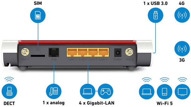 - Router Wi-Fi con módem LTE de categoría 4 integrado para las bandas FDD 1 (2,1 GHz), 3 (1,8 GHz), 5 (850 MHz), 7 (2,6 GHz), 8 (900 MHz), 20 (800 MHz) y 28 (700 MHz)