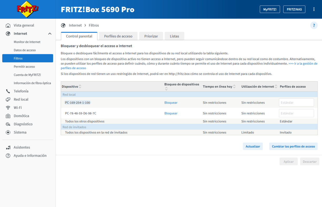 Con el control parental, se pueden configurar perfiles y filtros para varios dispositivos de la red local con el fin de restringir el acceso a aplicaciones o a sitios de Internet o limitar el tiempo en línea. Así es como FRITZ! apoya también el uso seguro de Internet.
