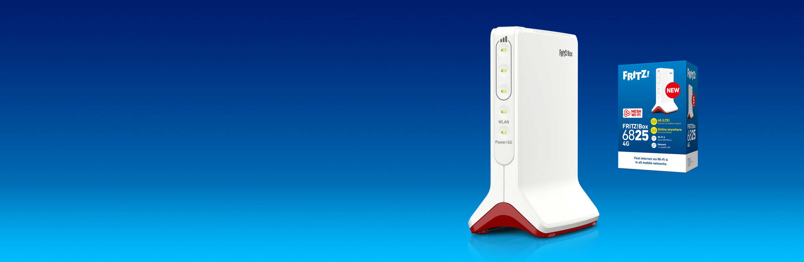 Il FRITZ!Box 6825 4G Edition International offre Internet tramite 4G (LTE) con velocità fino a 300 Mbit/s e il potente standard Wi-Fi AX con velocità fino a 600 Mbit/s.