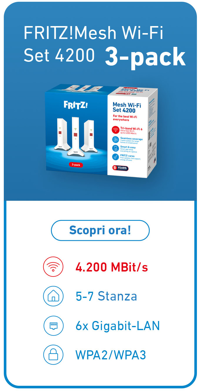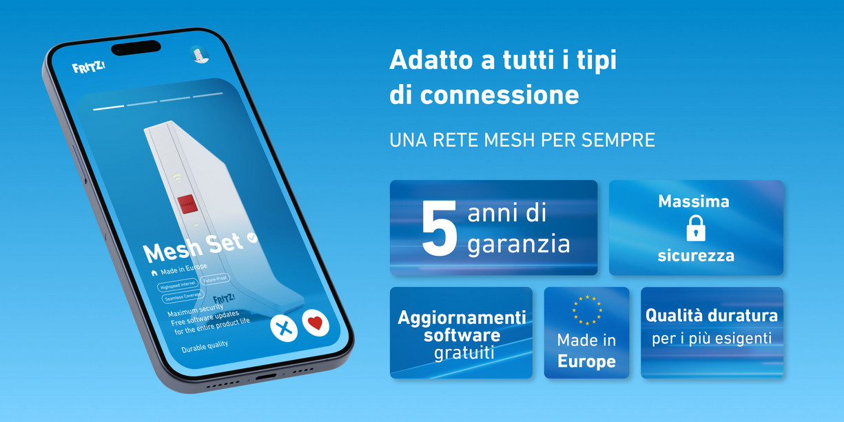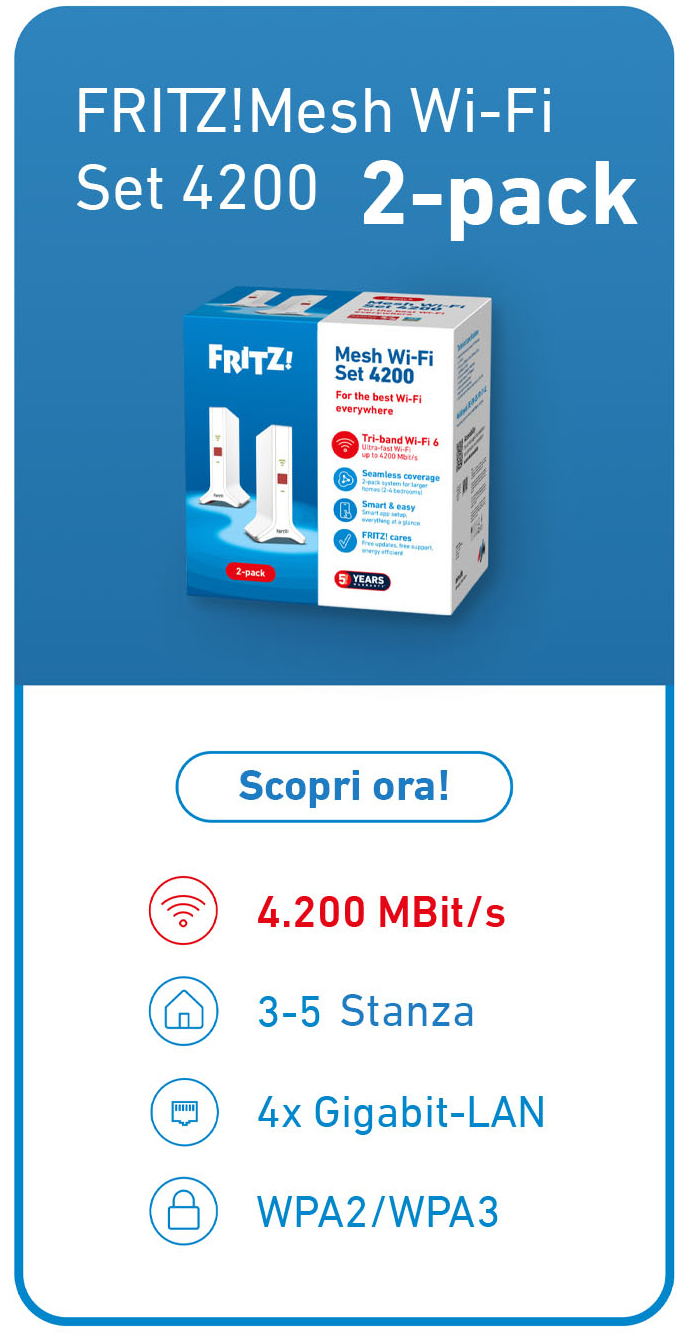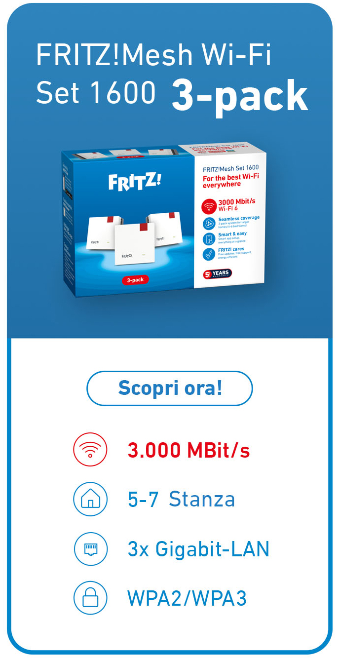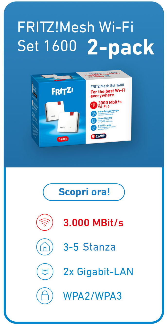 Aumenta le vendite dei nuovi FRITZ!Mesh Wi-Fi Set con i nostri nuovissimi banner online. Scaricali dalla sezione Marketing > Download e integrali direttamente nel tuo sito web.