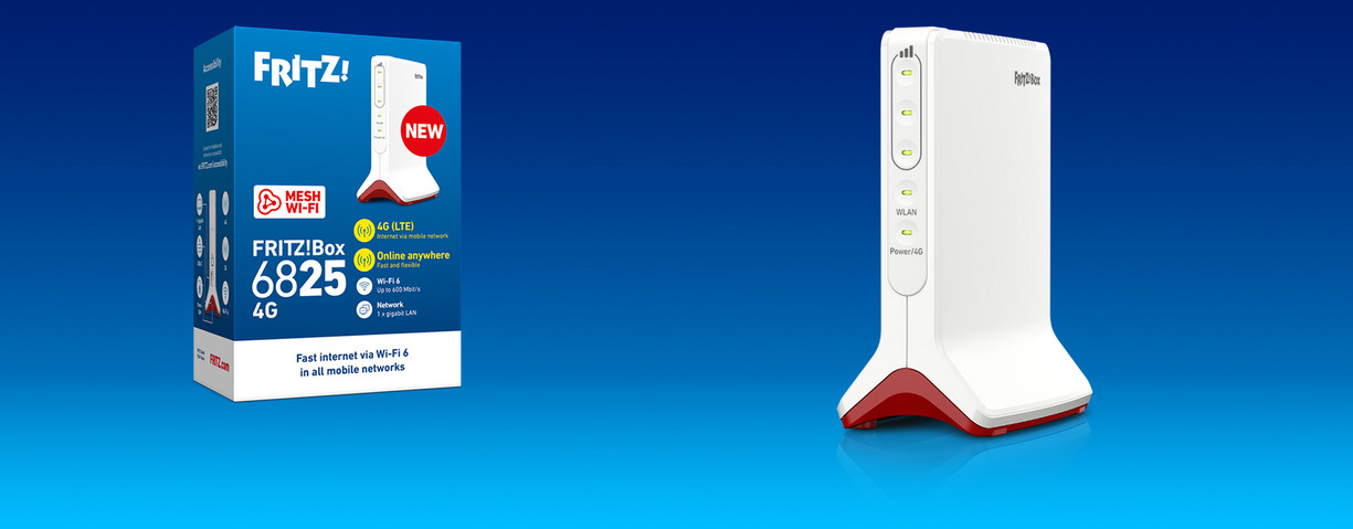 Il FRITZ!Box 6825 4G Edition International offre Internet tramite 4G (LTE) con velocità fino a 300 Mbit/s e il potente standard Wi-Fi AX con velocità fino a 600 Mbit/s. Una porta LAN gigabit permette il collegamento diretto di altri dispositivi. È inoltre ideale come dispositivo di backup (FRITZ! Failsafe) in combinazione con un altro FRITZ!Box con modem integrato e sistema operativo a partire da FRITZ!OS 8.20, per avere a disposizione Internet e rete Wi-Fi anche in caso di interruzione della connessione di rete fissa.
