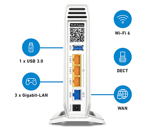 Il FRITZ!Box 4060 è un router veloce a tre bande radio con Wi-Fi 6, che assicura velocità altissime nella rete Wi-Fi. Le svariate possibilità di connessione permettono di impiegare il 4060 con flessibilità su cavo, DSL o fibra. E grazie alla funzione NAS integrata, il 4060 diventa il centralino multimediale della rete locale. Altre funzioni, ad esempio un centralino di qualità con base DECT, un firewall integrato e un comando per la Smart Home, completano l'offerta.