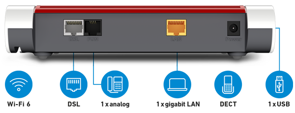 - Modem integrato per tutte le connessioni (V)DSL fino a 300 Mbit/s (incluso Supervectoring) e ADSL2+