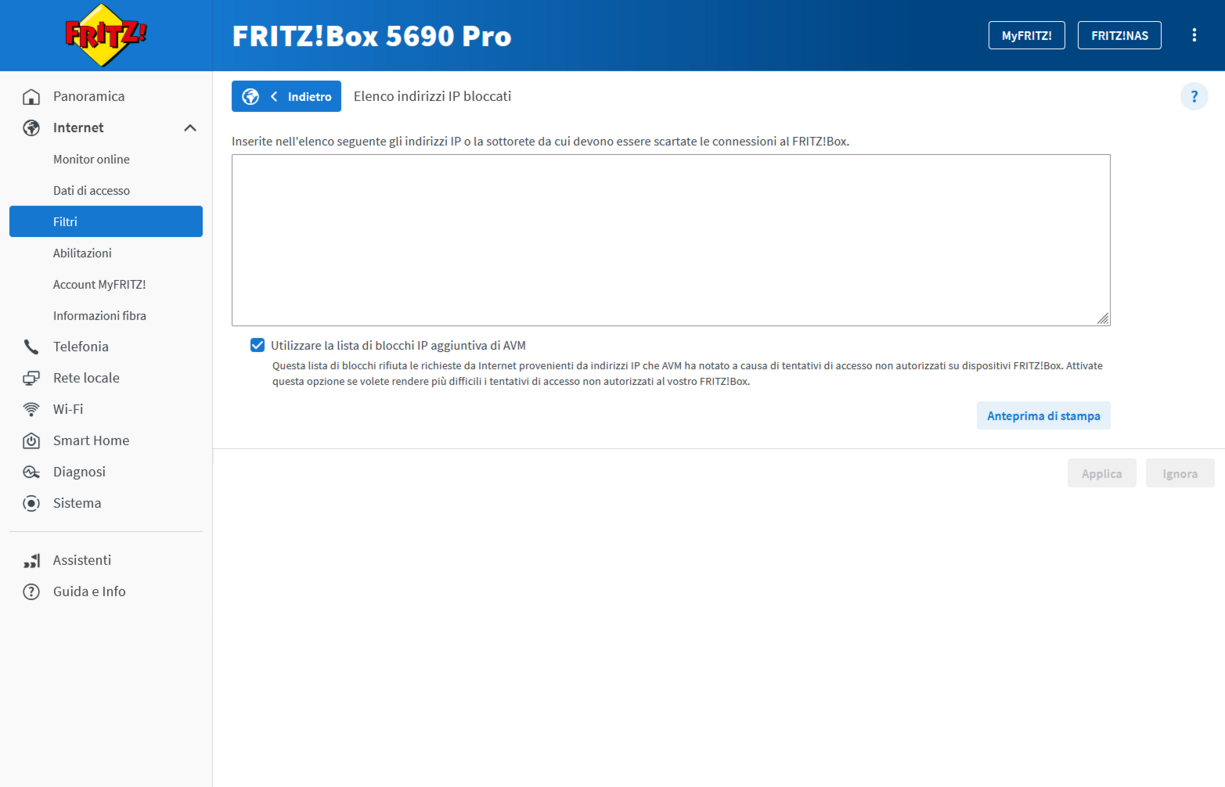 Per proteggere dagli attacchi di forza bruta i modelli di FRITZ!Box raggiungibili da Internet, FRITZ! offre una nuova funzione di sicurezza: una lista di blocchi IP. Con questa lista è possibile definire singoli indirizzi IP o interi intervalli di indirizzi IP ai quali bloccare completamente l'accesso al FRITZ!Box. Tutti i pacchetti di dati provenienti da questi indirizzi saranno quindi respinti.