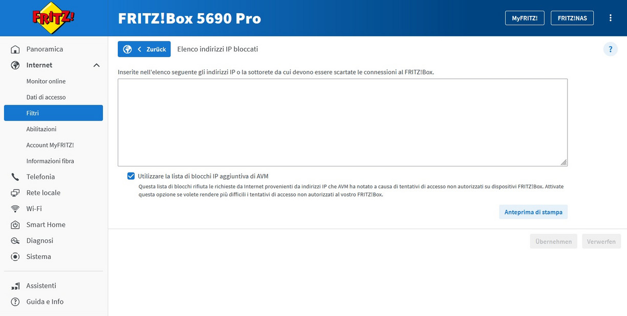 Per garantire una sicurezza ancora maggiore, le nostre esperte e i nostri esperti di sicurezza verificano regolarmente gli indirizzi IP sospetti. Gli indirizzi IP identificati come dannosi vengono aggiunti alla lista di blocco FRITZ!, in modo che le relative pagine vengano automaticamente bloccate.