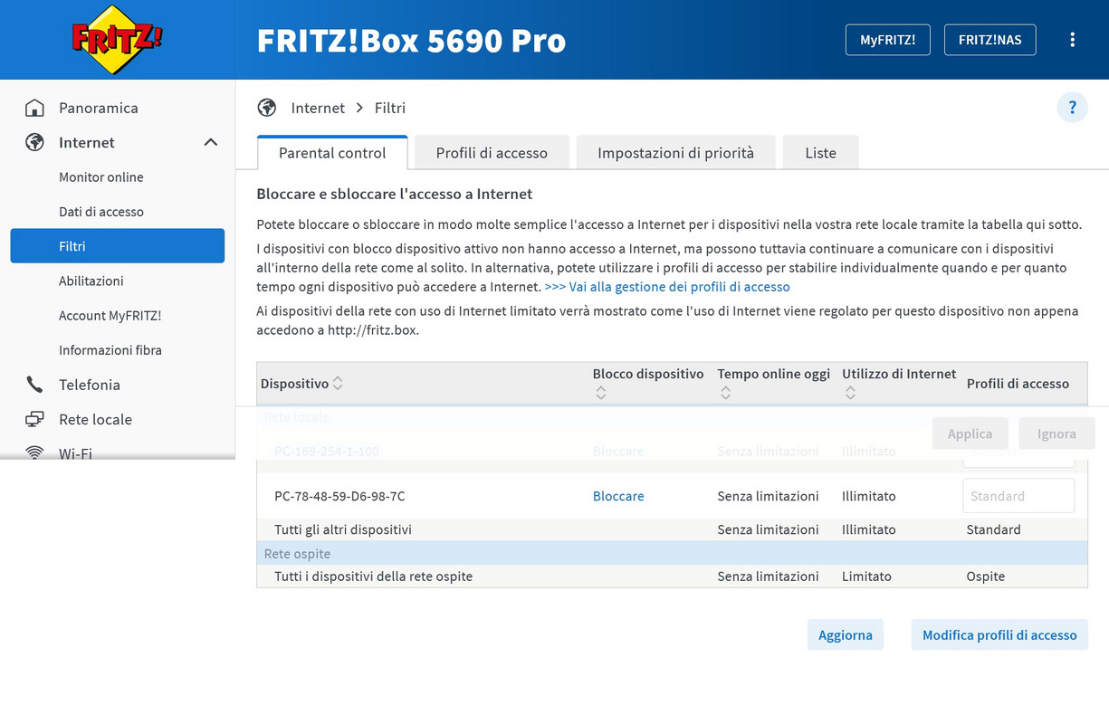 Con il parental control puoi configurare profili e filtri per vari dispositivi nella rete locale e impedire così l'accesso ad applicazioni o siti Internet o limitare il tempo di permanenza online. In questo modo il team FRITZ! fornisce un contributo importante a un utilizzo sicuro di Internet.