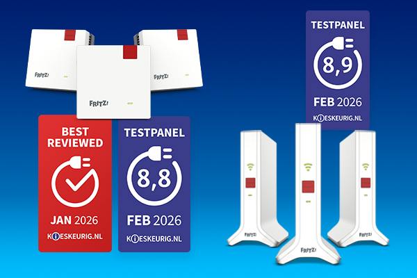 In de producttest van Kieskeurig.nl hebben de FRITZ!Mesh Wi-Fi Set 4200 en de FRITZ!Mesh Wi-Fi Set 1700 elk zeer goede resultaten behaald.
