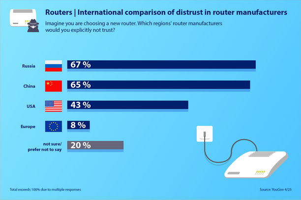 Het marktpotentieel is reëel: volgens een YouGov-onderzoek in opdracht van FRITZ! wantrouwen de ondervraagden routerfabrikanten uit Rusland (67 %), China (65 %) en de VS (43 %) aanzienlijk vaker dan Europese aanbieders, waar slechts 8 % sceptisch tegenover staat. Klanten zijn actief op zoek naar alternatieven die ze kunnen vertrouwen. Met FRITZ! is dit alternatief binnen handbereik.