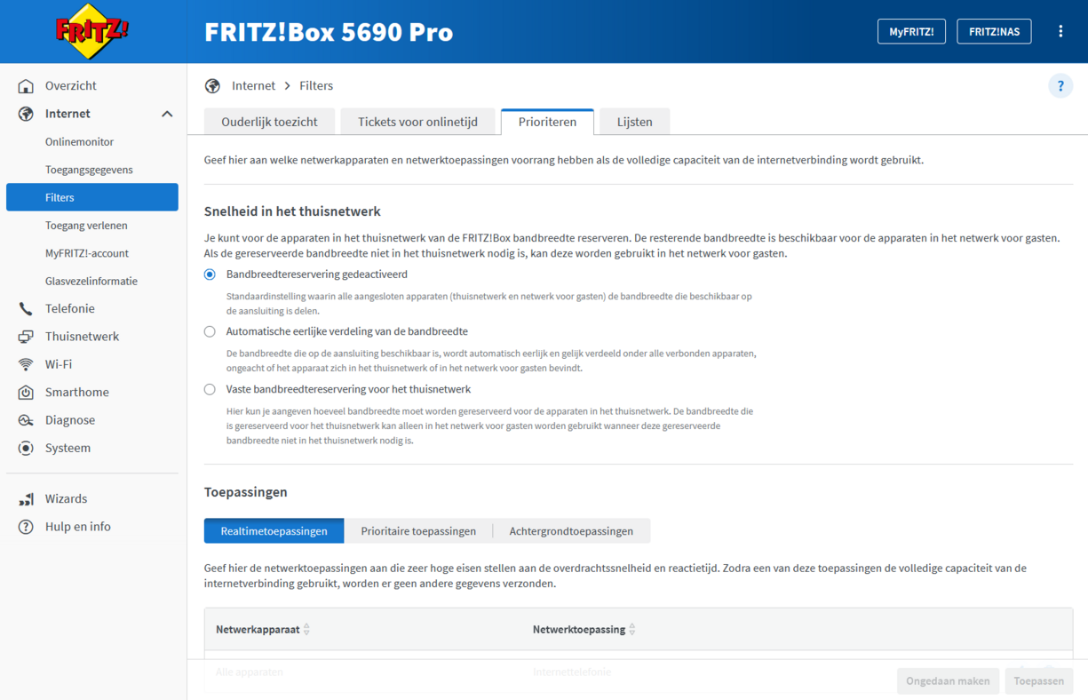 - Op het tabblad Prioriteren kun je instellen welke netwerkapparaten en netwerktoepassingen voorrang hebben bij een overbelaste internetverbinding. Je kunt ook voor apparaten in het thuisnetwerk van de FRITZ!Box bandbreedte reserveren. De resterende bandbreedte is beschikbaar voor de apparaten in het netwerk voor gasten. Als de gereserveerde bandbreedte niet in het thuisnetwerk nodig is, kan deze worden gebruikt in het netwerk voor gasten.