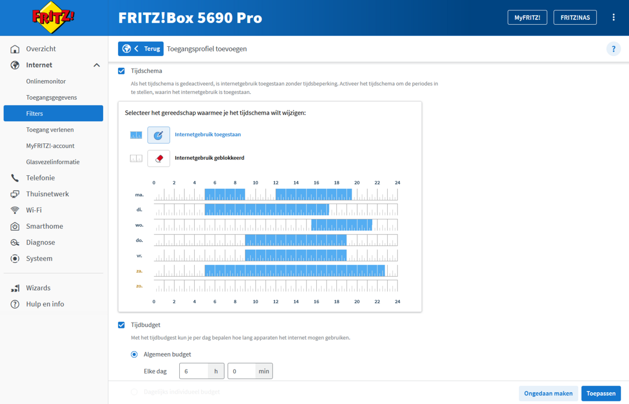 - Internet alleen toestaan op bepaalde tijden: activeer de optie Tijdschema en geef aan in welke periodes het internetgebruik is toegestaan of is geblokkeerd.